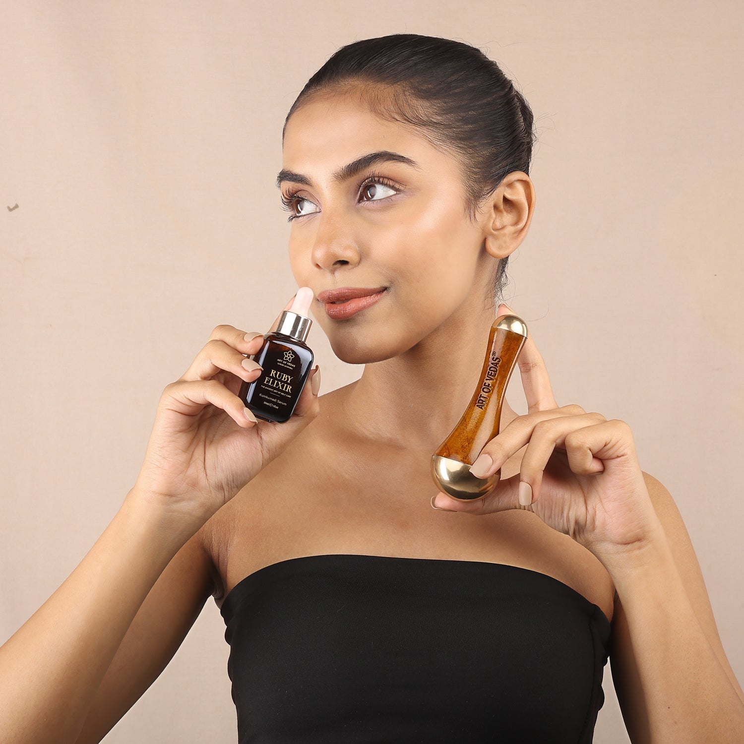 Začněte svůj denní nebo týdenní rituál péče jemným nanesením Kumkumadi séra na obličej a krk. Pomocí Kansa Wand provádějte rytmické, kruhové pohyby přes marma body na obličeji. Tato tradiční technika nejen hluboce vyživuje pokožku, ale také harmonizuje doshas a podporuje relaxaci.