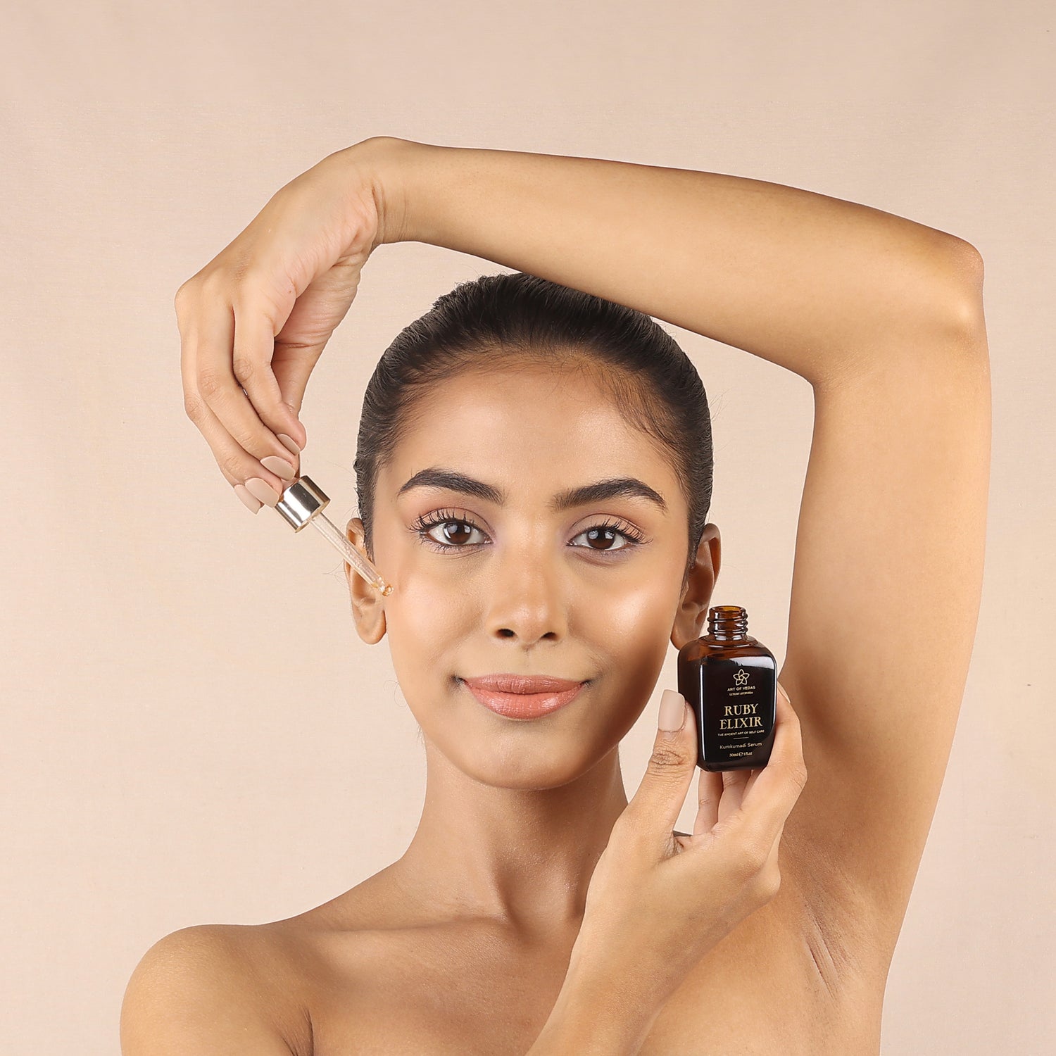 1. Ruby Elixir Kumkumadi Serum (30ml): Luxusní směs šafránu a Ayurvedic bylin pro zvýšení zářivosti, zlepšení struktury pokožky a podporu rovnoměrného tónu.