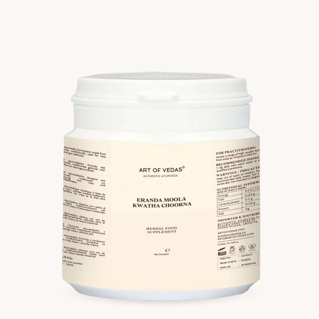 Eranda Moola Kwath Choornam je klasický Ayurvedic prášek z odvaru připravený z kořene Ricinus communis (ricinovník). Tradičně se používá k uklidnění zvýšené Vata dosha, zejména v dolních končetinách, pánvi a páteři. Je známý svými hluboce působícími vlastnostmi a běžně se předepisuje při stavech souvisejících s Vata a v terapiích Panchakarma.