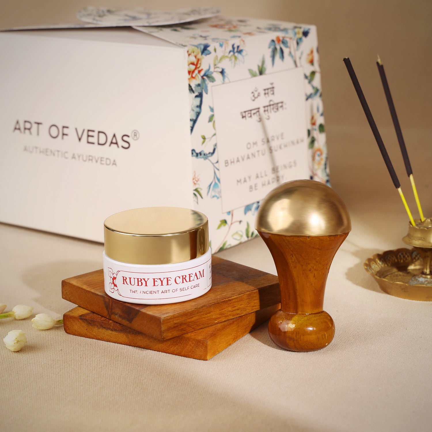 Zažijte ájurvédskou praxi Netra Abhyanga, omlazující rituál pro jemnou oblast očí, s Kumkumadi Eye Care Kit. Tento set obsahuje Ruby Eye Cream, luxusní směs šafránu a ájurvédských bylin pro hydrataci, rozjasnění a snížení viditelnosti tmavých kruhů a jemných linek, a Mini Kansa Wand, navržený pro přesnou masáž marma bodů k obnovení rovnováhy a zvýšení zářivosti.