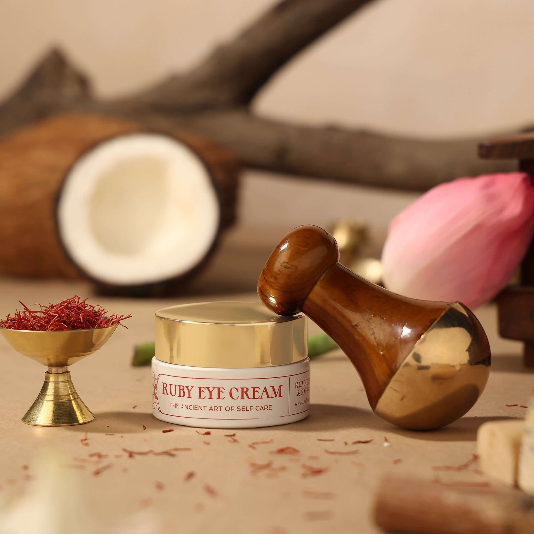 Sada péče o oči Kumkumadi nabízí komplexní přístup k péči o oblast pod očima prostřednictvím ájurvédského rituálu Netra Abhyanga. Ruby Eye Cream hluboce hydratuje a vyživuje jemnou pokožku, pomáhá snižovat otoky, tmavé kruhy a jemné vrásky, zatímco Mini Kansa Wand stimuluje krevní oběh a jemně masíruje klíčové marma body pro lepší relaxaci a tok energie. Společně zlepšují vstřebávání produktu, omlazují oční okolí a podporují svěží, zářivý a mladistvý vzhled.