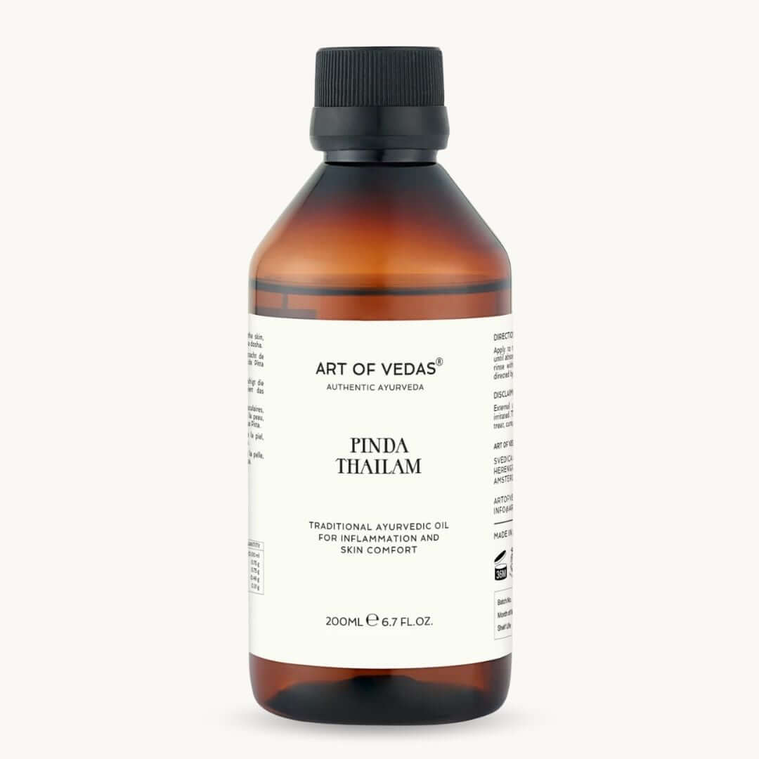 Pinda Thailam je klasická Ayurvedic formulace proslulá svými chladivými a uklidňujícími vlastnostmi. Název pochází z "Pinda" (což znamená koule nebo balík) a "Thailam" (olej), což odráží jeho tradiční použití v terapiích založených na obkladech. Tento rubínově červený olej je speciálně formulován pro stavy zahrnující teplo, pálení a zánět.
