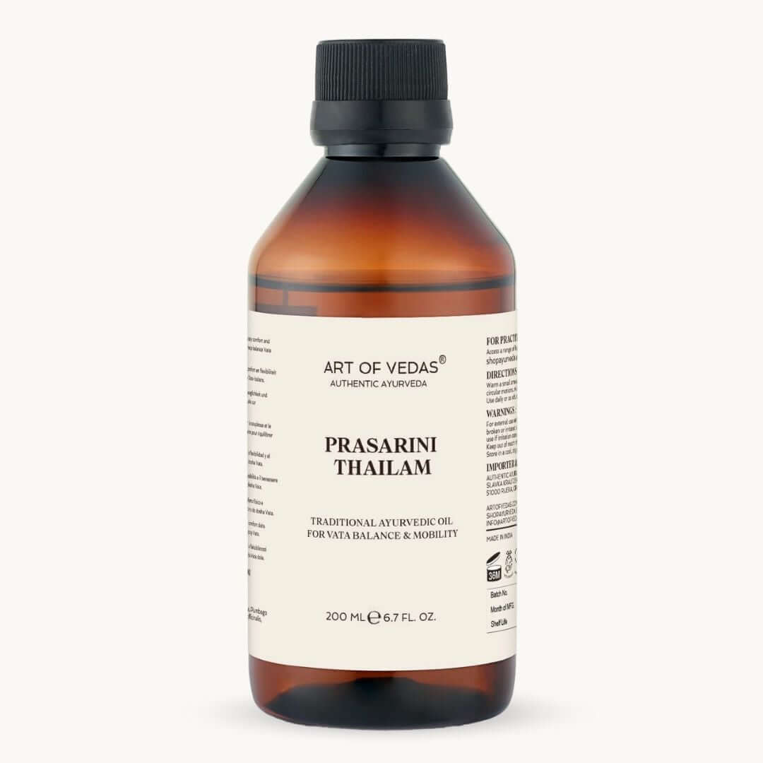 V Ayurvedě jsou klouby a svaly primárními místy Vata doshy. Když se Vata zhorší, tyto tkáně mohou být suché, studené, ztuhlé a nepříjemné. Prasarini Thailam to řeší pečlivě vyváženou kombinací zahřívajících, pronikavých a vyživujících bylin, které společně pracují na obnovení pohodlí a snadnosti pohybu.